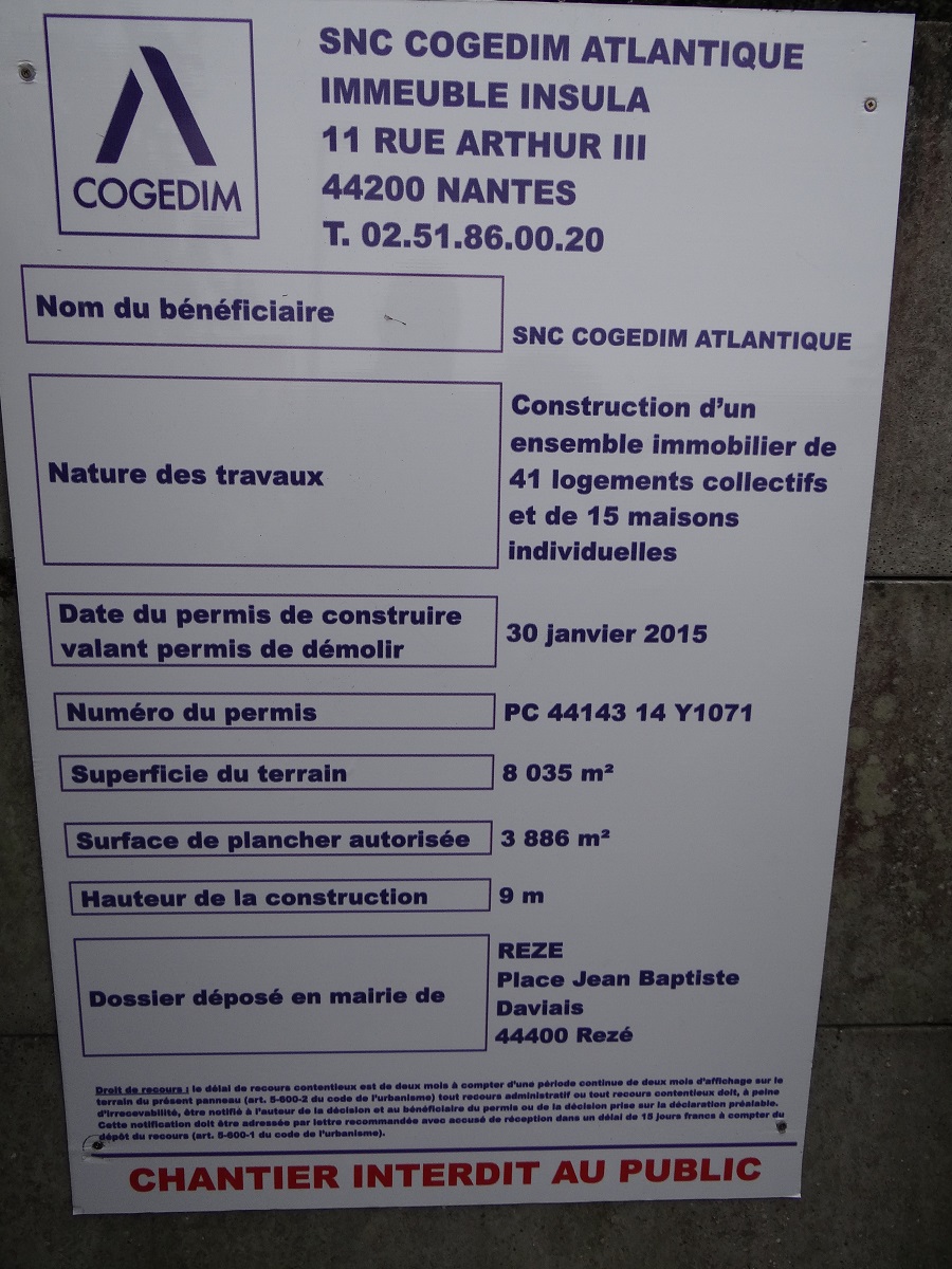 Par mail du 3 février 2015 reçu du promoteur COGEDIM, nous avons appris que Monsieur le Maire de Rezé a signé le permis de construire le 30 janvier 2015 concernant la construction des immeubles et des maisons sur le terrain des Naudières, accessible par l'impasse des Pélouées.