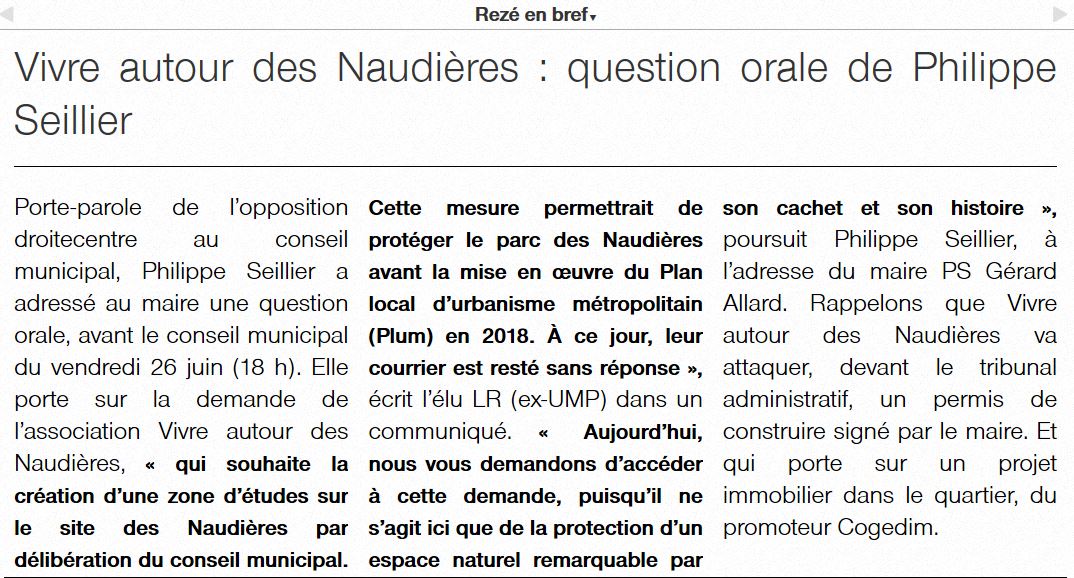 Page d'accueil > Question orale de M. Sellier à M. Allard avant le conseil municipal du 26 juin. Il attend que le maire réponde à l'association suite à leur demande de "création d'une zone d'étude sur le site des Naudières", restée sans réponse depuis le 30 mars.