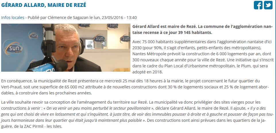 Interview de Gérard Allard, Maire de Rezé, sur le PLUM qui sera adopté par Nantes Métropole en 2018 et sur l'aménagement des 65 000m² du Vert-Praud. (Sun Radio le 23 mai 2016)