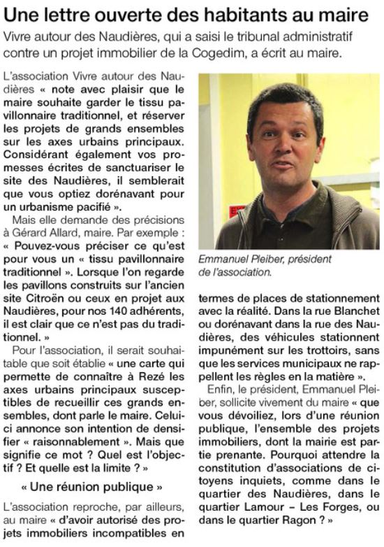 Lettre ouverte de l'association "VIVRE AUTOUR DES NAUDIERES" remise M. le Maire de Rezé. Article Ouest France du 23/01/2016