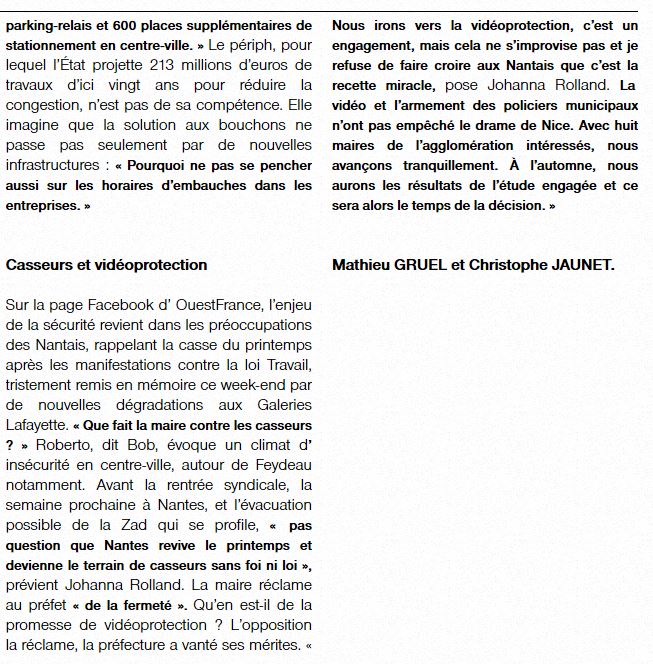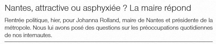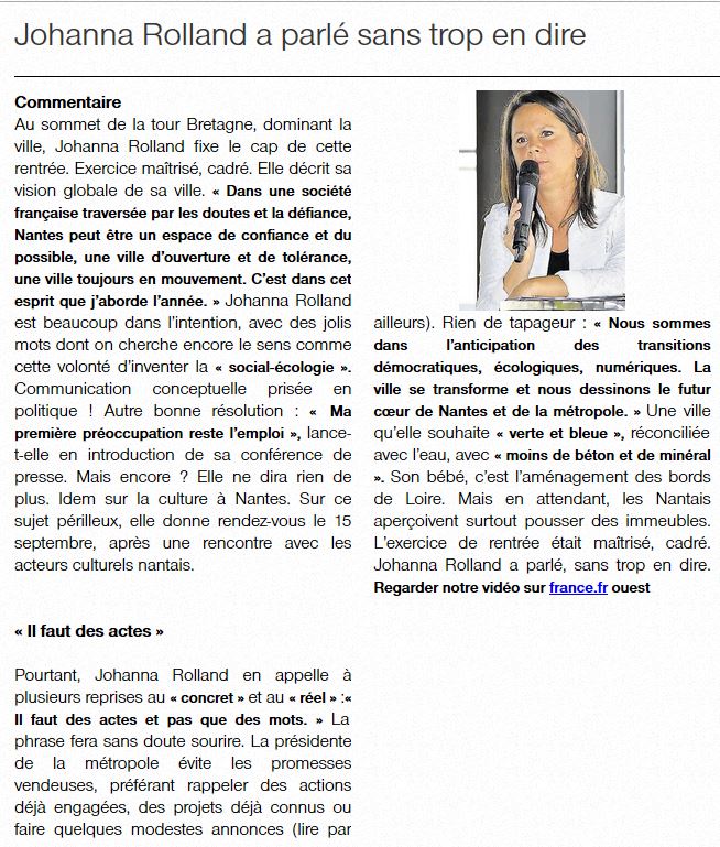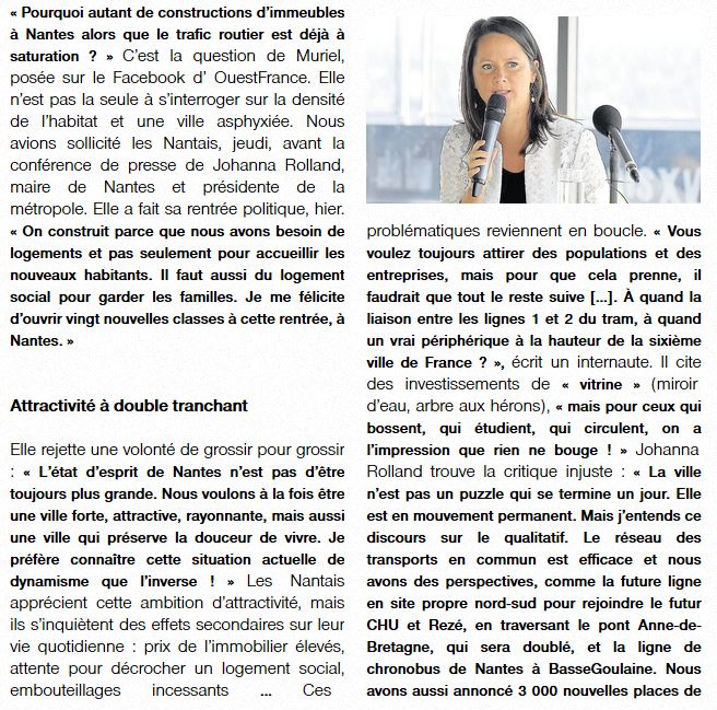 Nantes, attractive ou asphyxiée ? La maire de Nantes, Johanna Rolland, répond. Article Ouest France du 3 septembre 2016